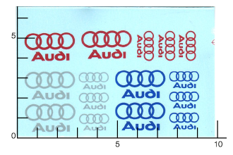 Décalcomanie à l'eau, thème de la planche « Audi Argent rouge bleu », échelle 1/43e.