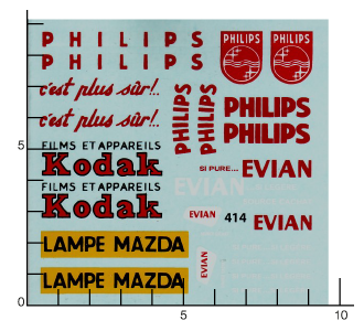Décalcomanie à l'eau, thème de la planche « Dinky Evian Kodak Philips ».